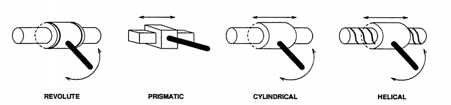There are six types of joints commonly used, termed “lower pair” joints: Revolute joint(1 DOF), Prismatic joint (1 DOF), Screw joint (1 DOF), Cylindrical joint (2 DOF),Planar joint (2 DOF), and Spherical joint (3 DOF).